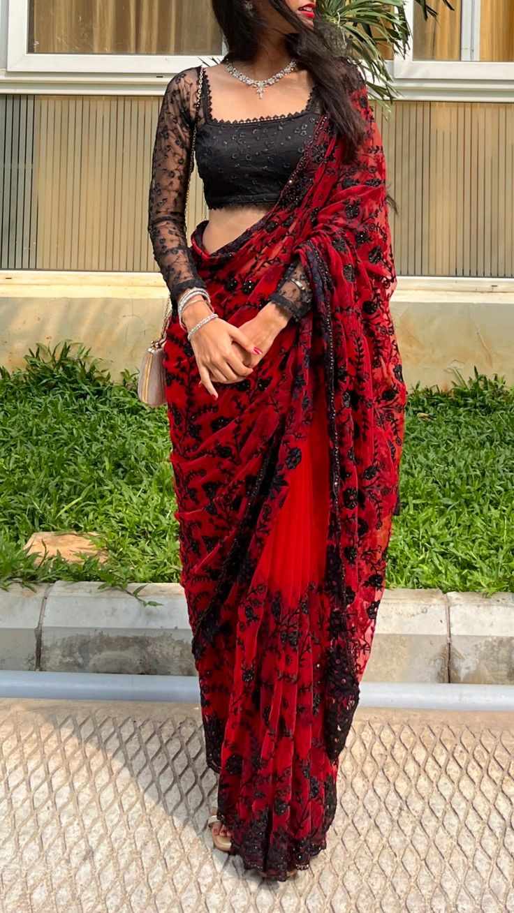 After a few more minutes, Ishana stood transformed, beautifully draped in her vibrant red saree. The black elements she had chosen earlier with Abhiman added a striking contrast, making her look both lively and sophisticated.