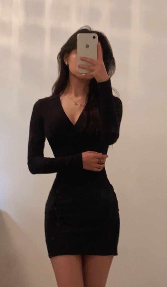 A few hours later, Vanshika stood outside the sprawling Kashyap mansion, leaning against her car and scrolling through her phone.Her figure was sharply defined in a sleek black mini-dress. The fabric, which looked like a fine knit or ribbed material, clung to her, highlighting her narrow waist. It featured a deep V-neckline and long sleeves, a simple yet undeniably elegant cut. She finished the look with a pair of long black heels that added height and a powerful final touch.The warm evening air was filled with the chatter of their friends, who were all catching up with each other's siblings.