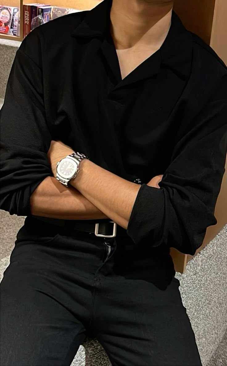 Abhiman’s look was defined by a powerful simplicity: an all-black ensemble. He wore a relaxed-fit black collared shirt, its sleeves cuffed neatly just above the wrist, paired with matching black trousers. The monochromatic outfit was punctuated only by the subtle gleam of a wide silver belt buckle and a bold, elegant silver wristwatch that stood out against the dark fabric.